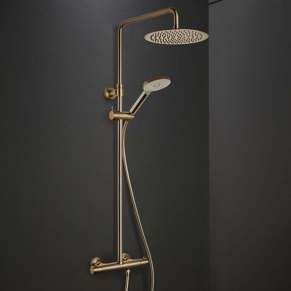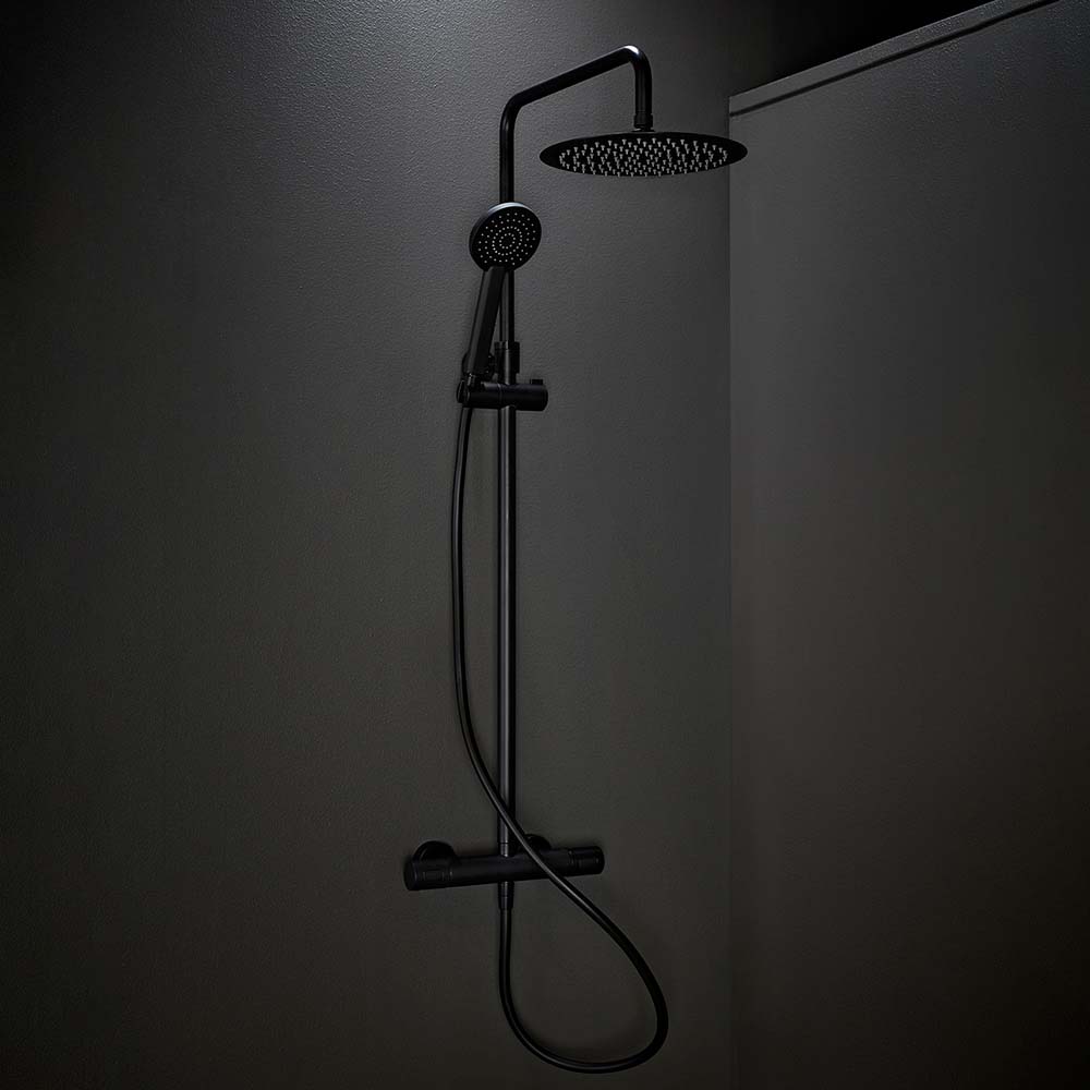 Kattosuihku neliskanttisella tai pyöreähköllä termostaattisekoittajalla. Elegantti siro suihkupää on ainoastaan 3 mm paksu ja valmistettu ruostumattomasta teräksestä.