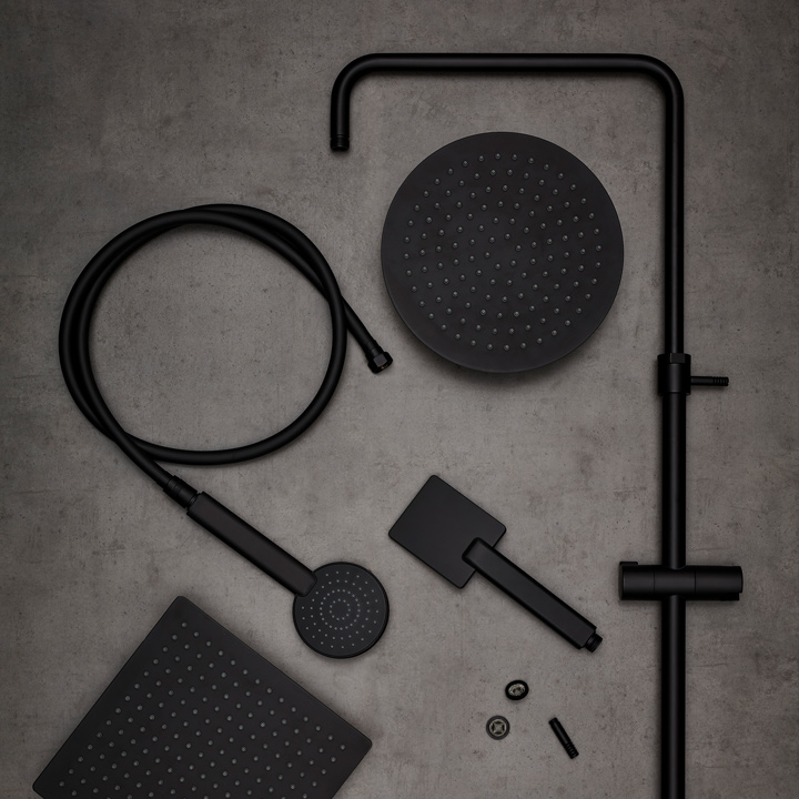 Uutuutemme Hafa Fine on kattosuihku kokonaisuus sirolla pyöristetyllä termostaattihanalla sekä ohuella suihkupäällä josta löytyy kolme eri kokoa.