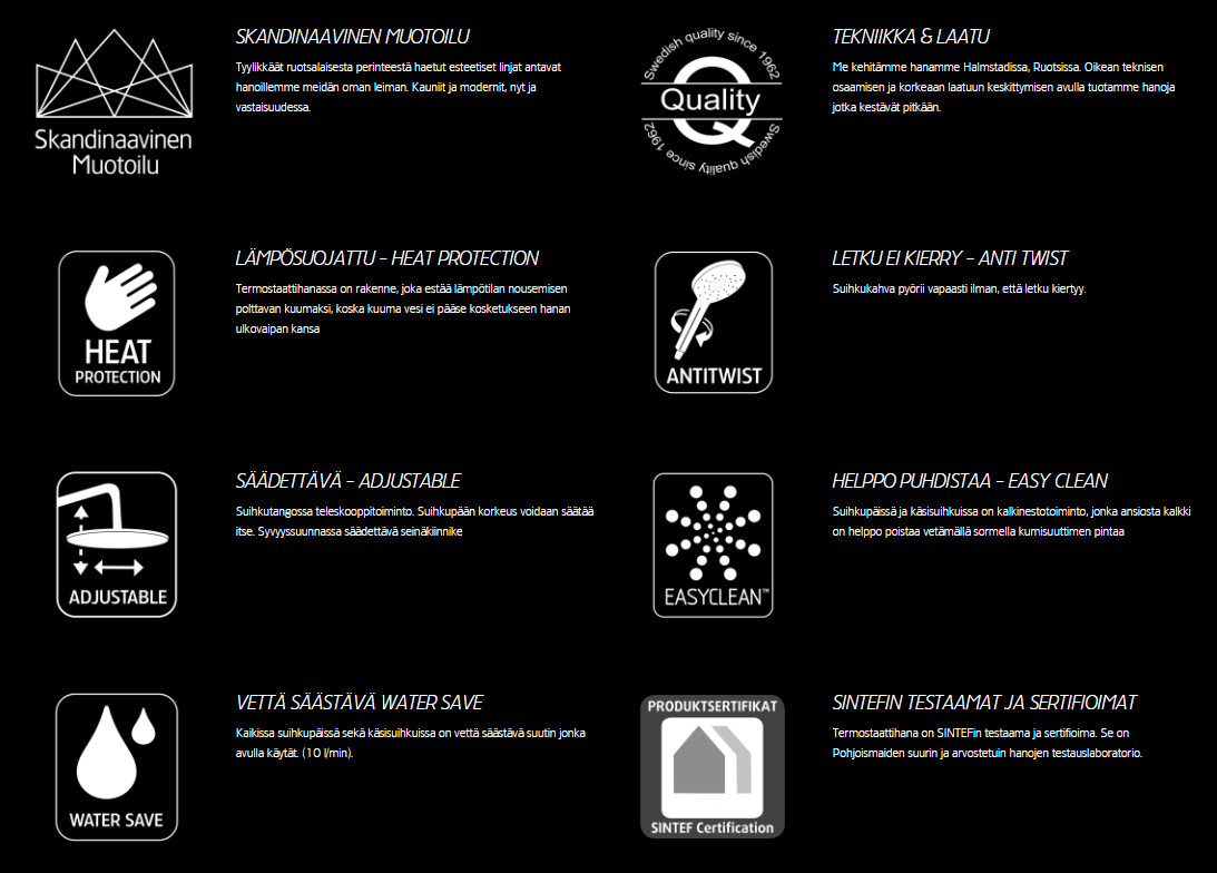 Termostaattihanoissamme on ylikuumenemissuoja sekä HeatProtection, joka merkitsee sitä että sekoittajan pinta ei lämpene polttavan kuumaksi.