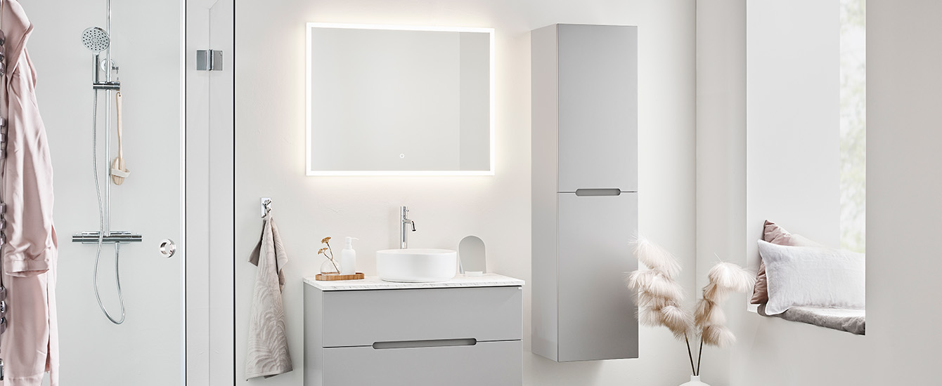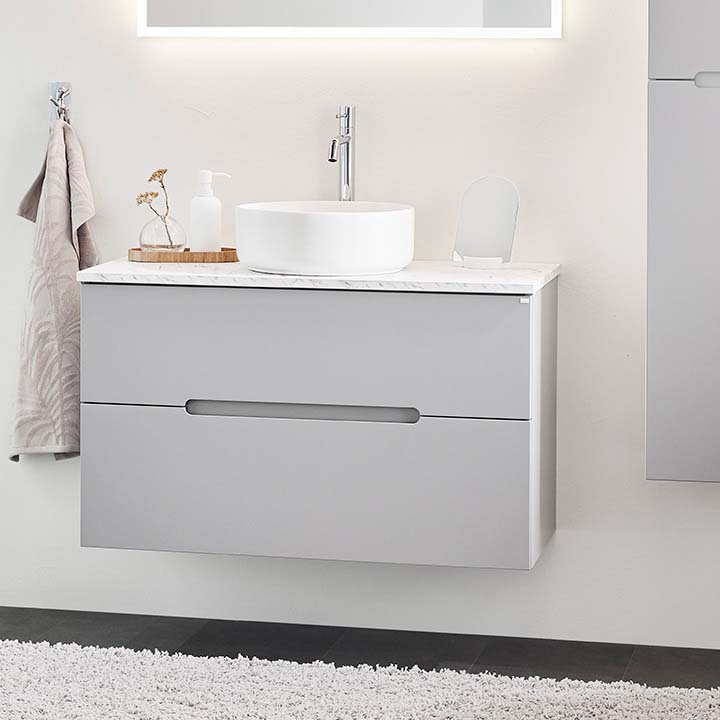 Vaaleat materiaalit kuten posliininen Hafa Circle ja kromin värinen allashana Fine yhdistettynä vaaleaan kalusteeseen luot tunnetta tarkkaan harkitusta ja suunnitellusta kylpyhuoneesta. Tässä integroiduilla vetimillä varustettu Hafa Sun.