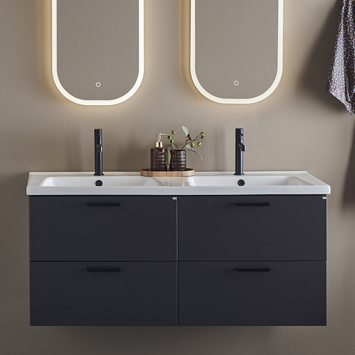 Yhdistä mustilla yksityiskohdilla oleva Hafa suihku antrasiitinharmaisiin kalusteisiimme luodaksesi musta sävy sävyyn-tunne. Tässä esimerkkinä Hafa Shape. Täydennä elegantti yhdistelmä mustalla Hafa Mix Slim kattosuihkulla.