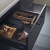 Pehmeästi sulkeutuviin laatikoihin on helppo pääsy kokonaan aukeavuuden vuoksi. Laatikkomatot ja bambu sisustus pitää pikkutavarat järjestyksessä. Kaluste toimitetaan koottuna ja asentaminen on helppoa säädettävän ripustinhelan avulla. Kaluste on mukautettu joko seinä- tai lattiaviemäröintiin. Yhdistämällä sivumoduulin kanssa tarjoutuu lisämahdollisuuksia joista löytyy sopiva kokonaisuus ihan jokaiseen kylpyhuoneeseen. Valitse joko upotettava posliini allas tai pöytälevylle asennettava malja-allas. Täydennä tyyliisi sopivalla vetimellä tai nupilla. Osta lisäksi allashana, pohjaventtiili, vesilukko, laatikonvalaistus ja pistorasia.