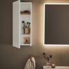 Matala seinäkaappi, jossa kaksi lasihyllyä ja pehmeästi sulkeutuva ovi, jonka voidaan asentaa oikealta tai vasemmalta avautuvaksi. Kaappi voidaan sijoittaa lattiatasoon tai seinälle, esimerkiksi wc-istuimen yläpuolelle, johon yleensä jää käyttämätöntä tilaa.
